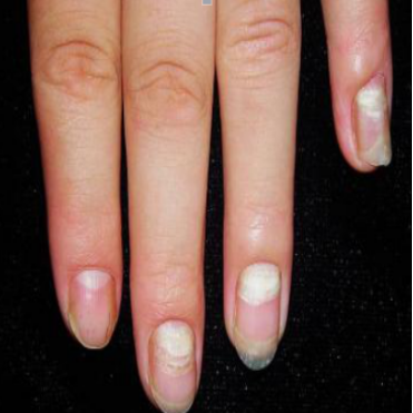 真菌感染,医学称之为甲癣,中医为鹅爪风,即皮肤真菌感染正常指甲所导致。指甲免疫功能低下,真菌趁虚而入,皮肤真菌阻断了正常指甲的营养供应。