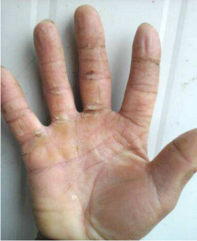 发病初期皮肤干燥、角化增厚、皮纹明显,沿皮纹出现裂口。严重者裂口可深达皮下,可有出血,自觉疼痛,以活动时更明显。如有细菌侵入,可发生化脓性感染。